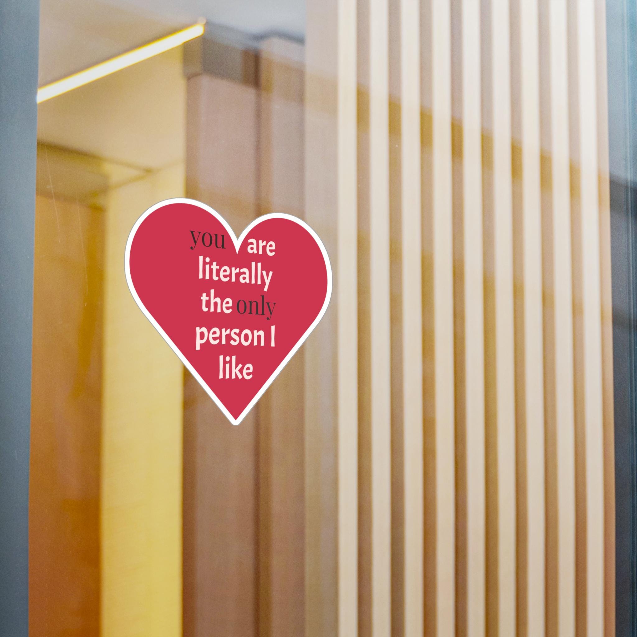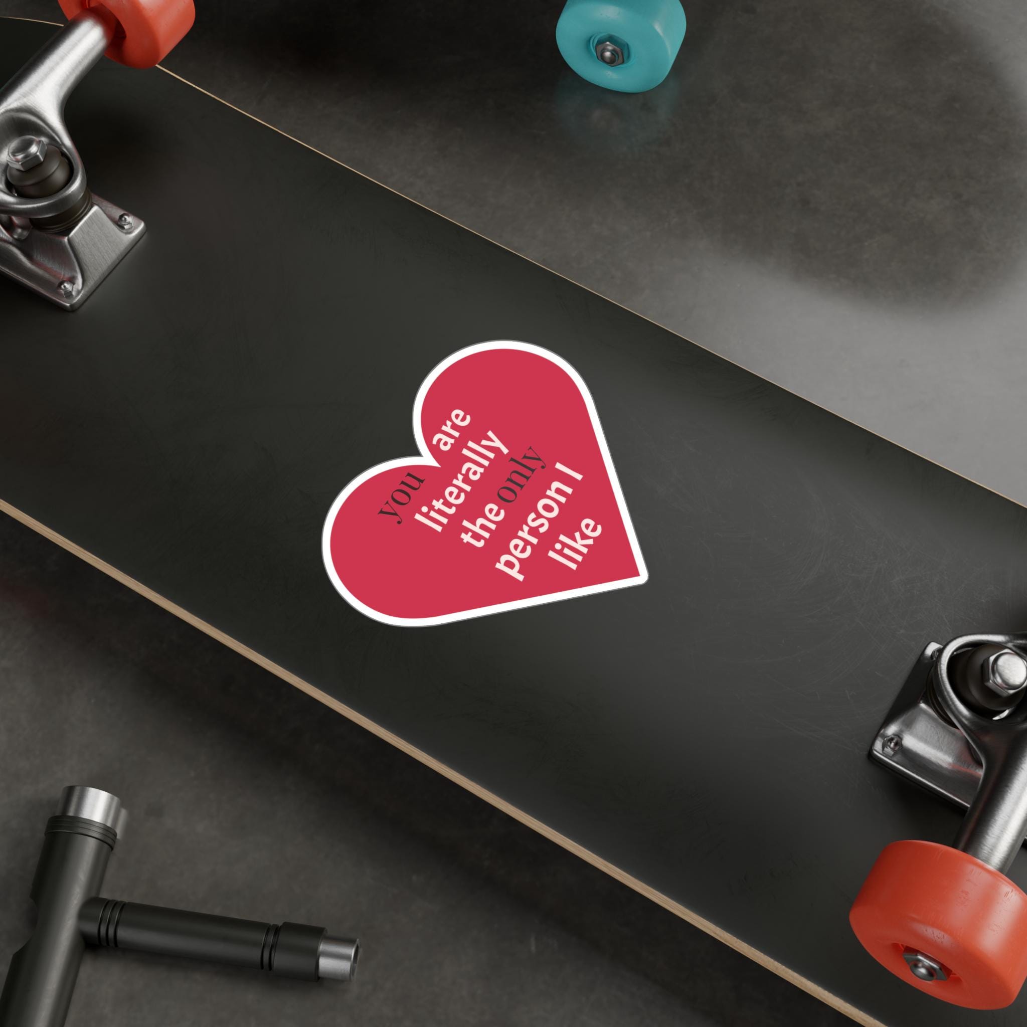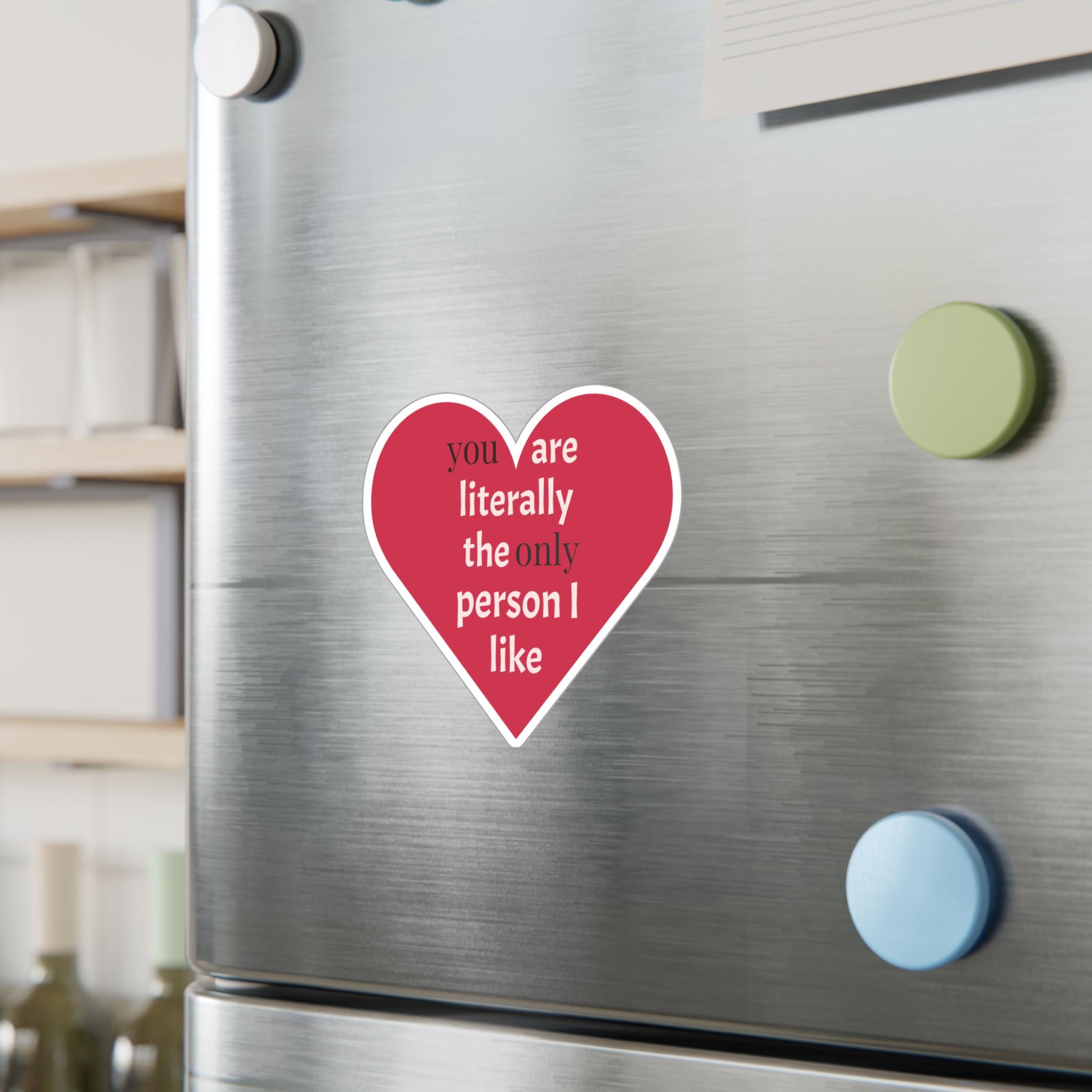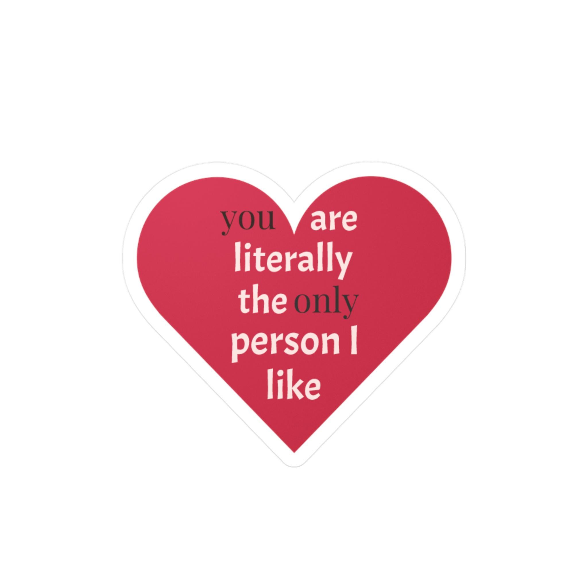 A cheeky heart-shaped kiss-cut vinyl decal that speaks in plain affection. The bold raspberry-red heart and clean white text — "you are literally the only person I like" — reads like a private joke turned public devotion. It clings smoothly to laptops, water bottles, phone cases, windows, and planners, then peels away cleanly when it’s time for a refresh. The satin finish keeps colors warm and soft to the touch while the durable vinyl stands up to rain, sun, and everyday scuffs for seasons of honest, playful messaging.