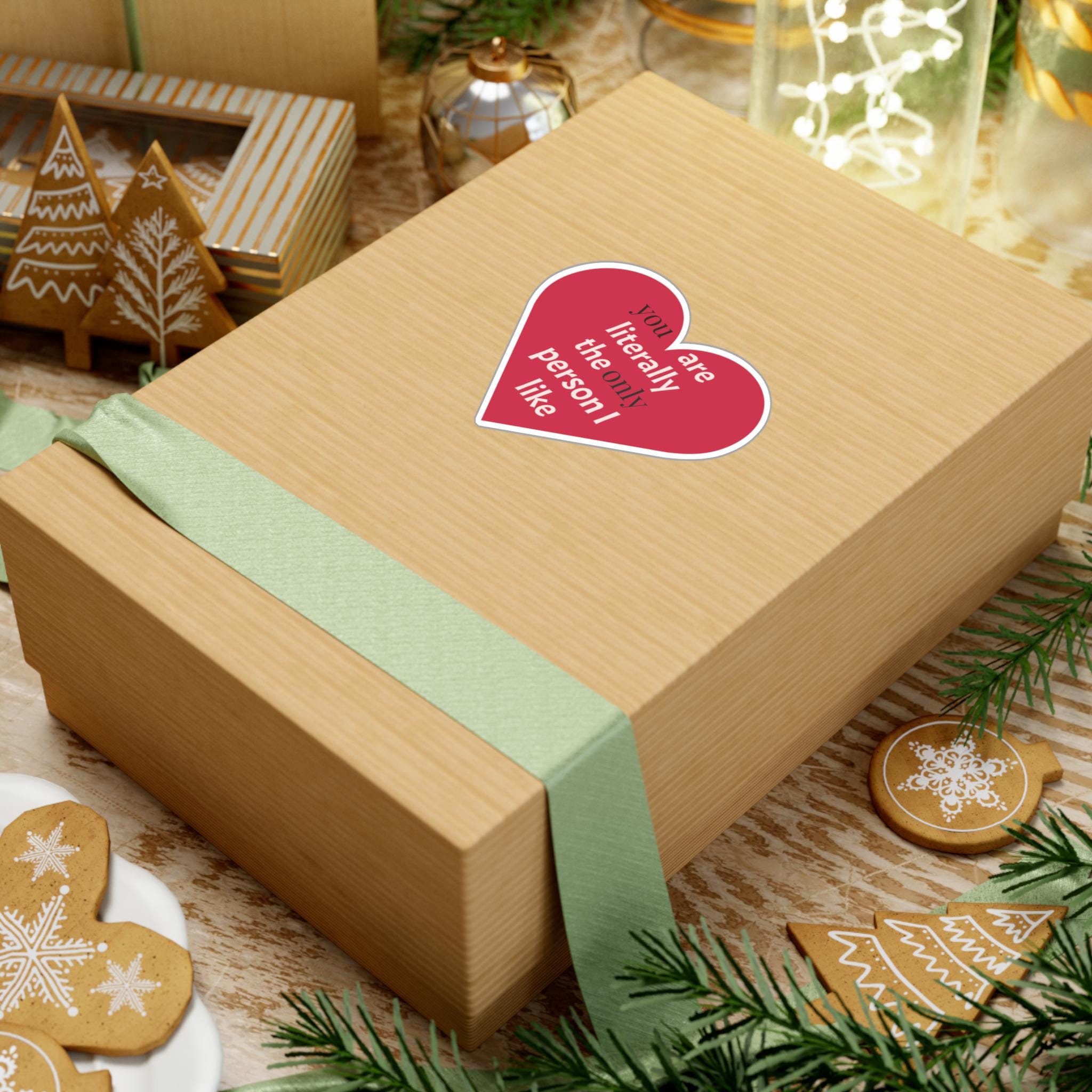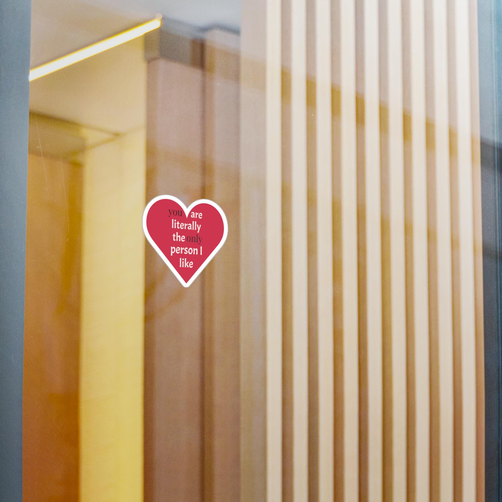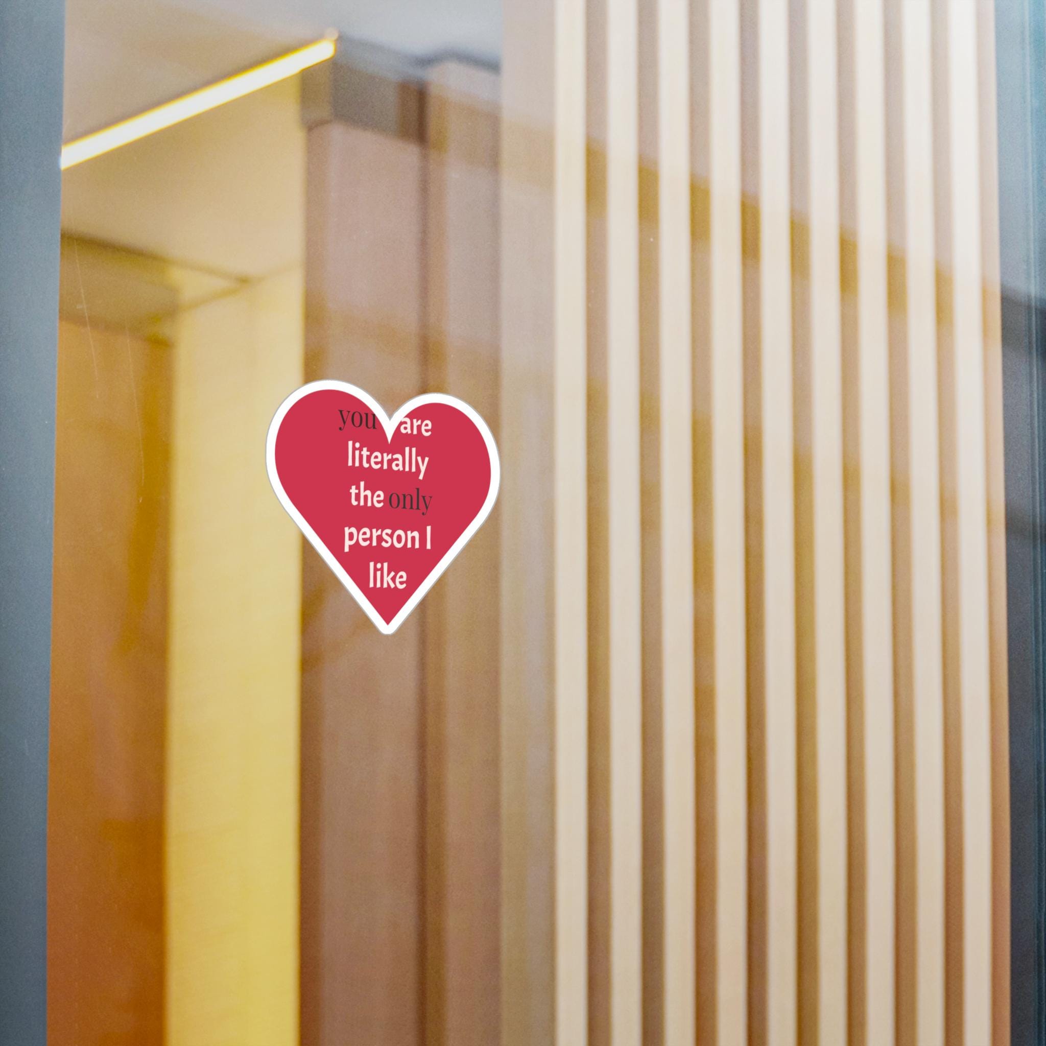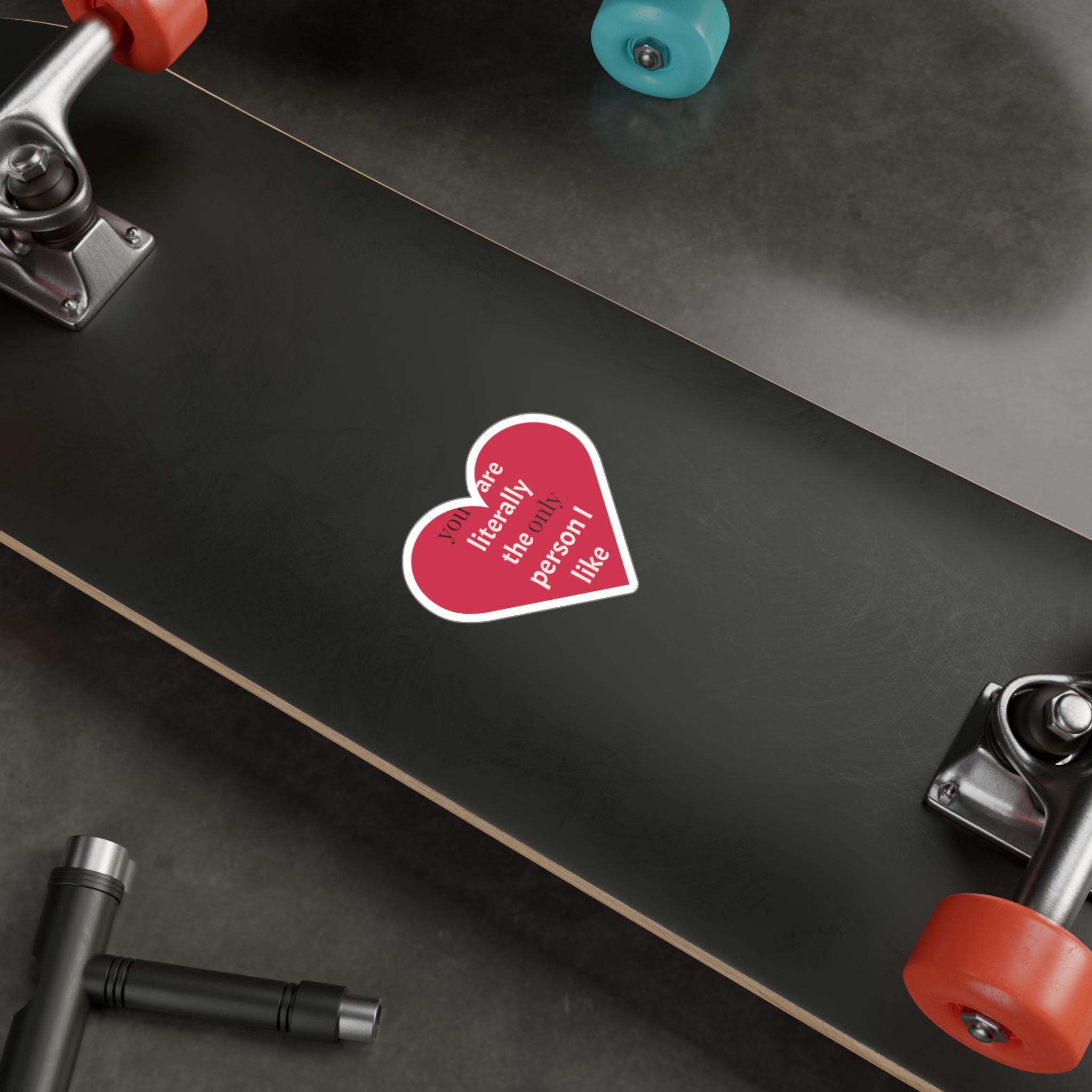 A cheeky heart-shaped kiss-cut vinyl decal that speaks in plain affection. The bold raspberry-red heart and clean white text — "you are literally the only person I like" — reads like a private joke turned public devotion. It clings smoothly to laptops, water bottles, phone cases, windows, and planners, then peels away cleanly when it’s time for a refresh. The satin finish keeps colors warm and soft to the touch while the durable vinyl stands up to rain, sun, and everyday scuffs for seasons of honest, playful messaging.