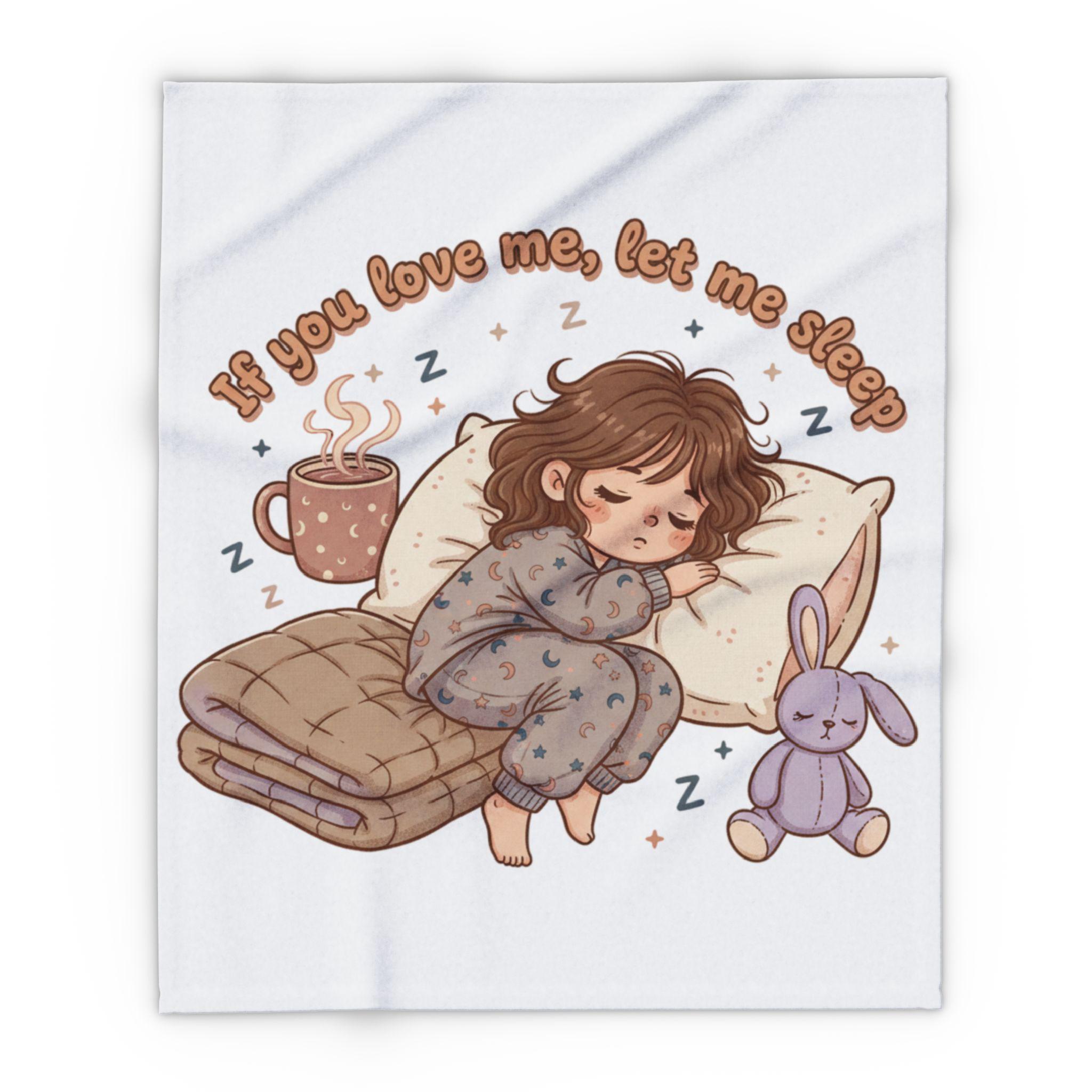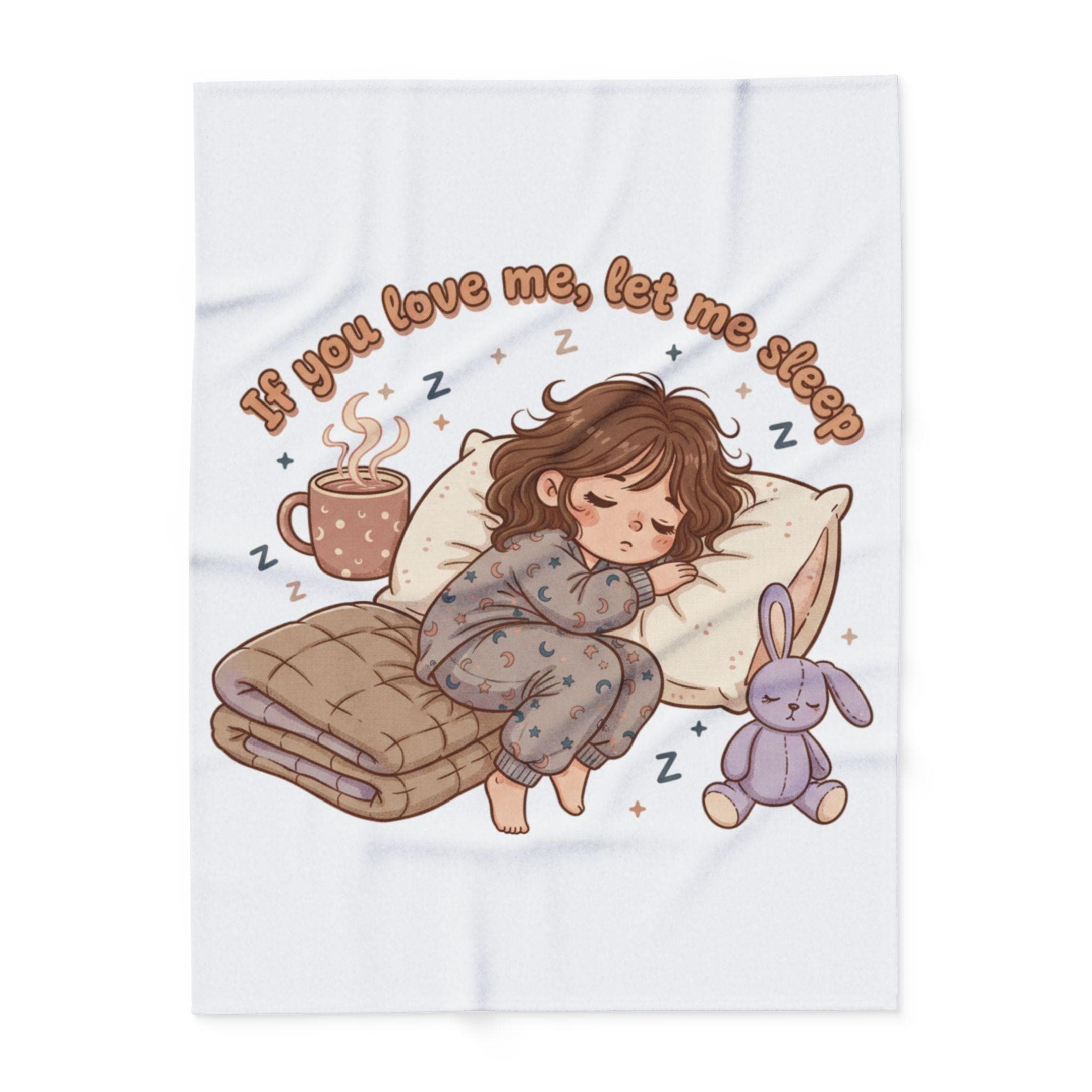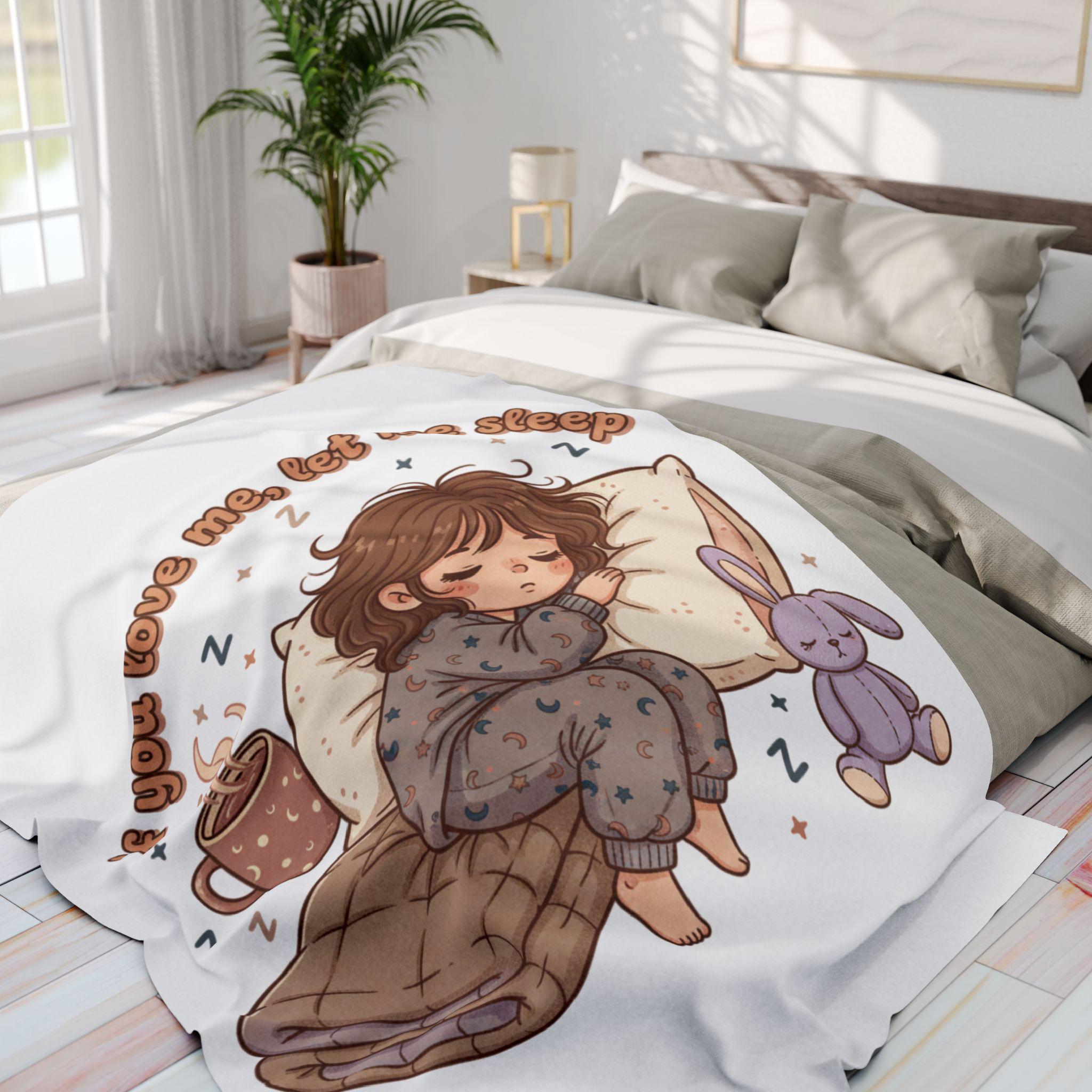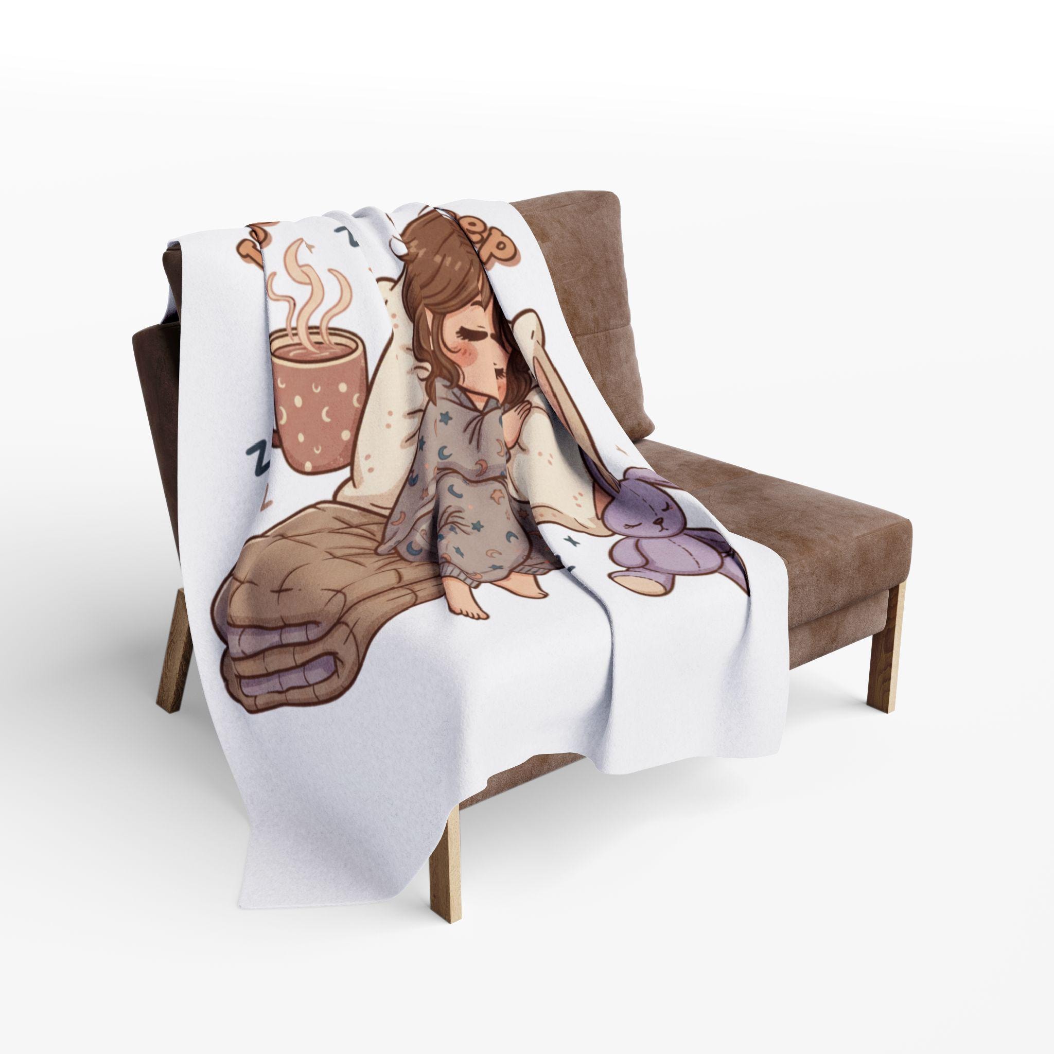 A cloud-soft fleece blanket that wraps quiet evenings in gentle warmth. The illustration shows a sleepy, pajama-clad figure curled up with a plush bunny, a steaming mug, and a folded blanket — the kind of sleepy, private scene that invites slow exhalations and bedside ritual. Muted warm browns and lavender tones keep the design cozy without shouting. Lay it over your lap during late-night reading, tuck it around shoulders while journaling by lamplight, or keep it ready on the sofa for low-energy self-care nights. It feels like a small, steady comfort that holds the hush of bedtime and the softness of home.