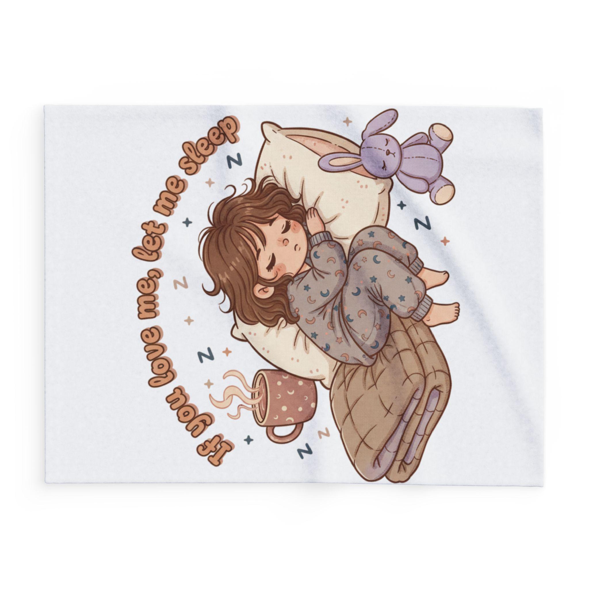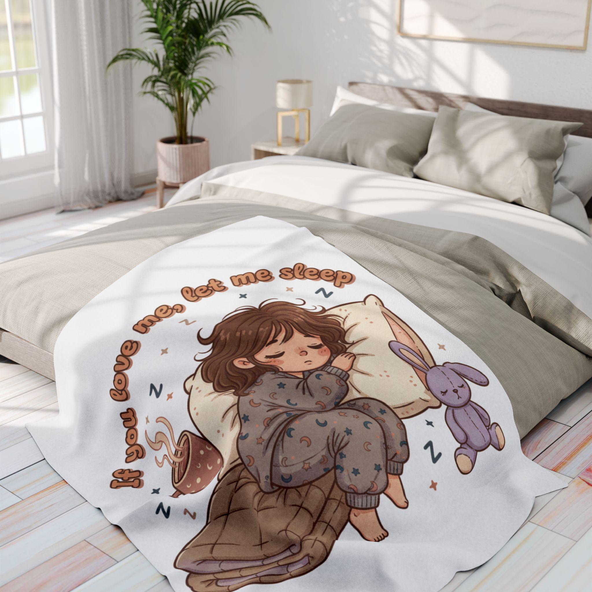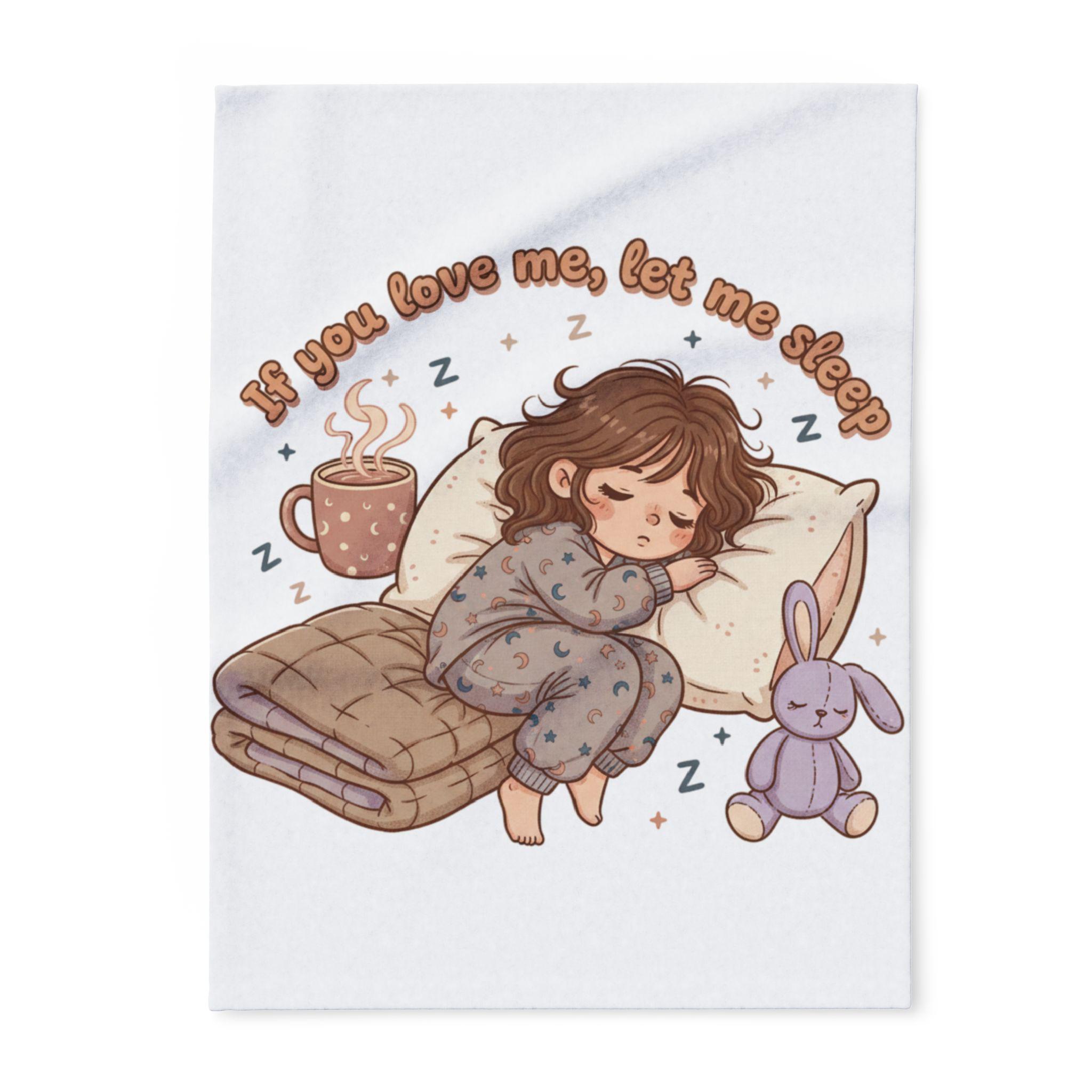 A cloud-soft fleece blanket that wraps quiet evenings in gentle warmth. The illustration shows a sleepy, pajama-clad figure curled up with a plush bunny, a steaming mug, and a folded blanket — the kind of sleepy, private scene that invites slow exhalations and bedside ritual. Muted warm browns and lavender tones keep the design cozy without shouting. Lay it over your lap during late-night reading, tuck it around shoulders while journaling by lamplight, or keep it ready on the sofa for low-energy self-care nights. It feels like a small, steady comfort that holds the hush of bedtime and the softness of home.