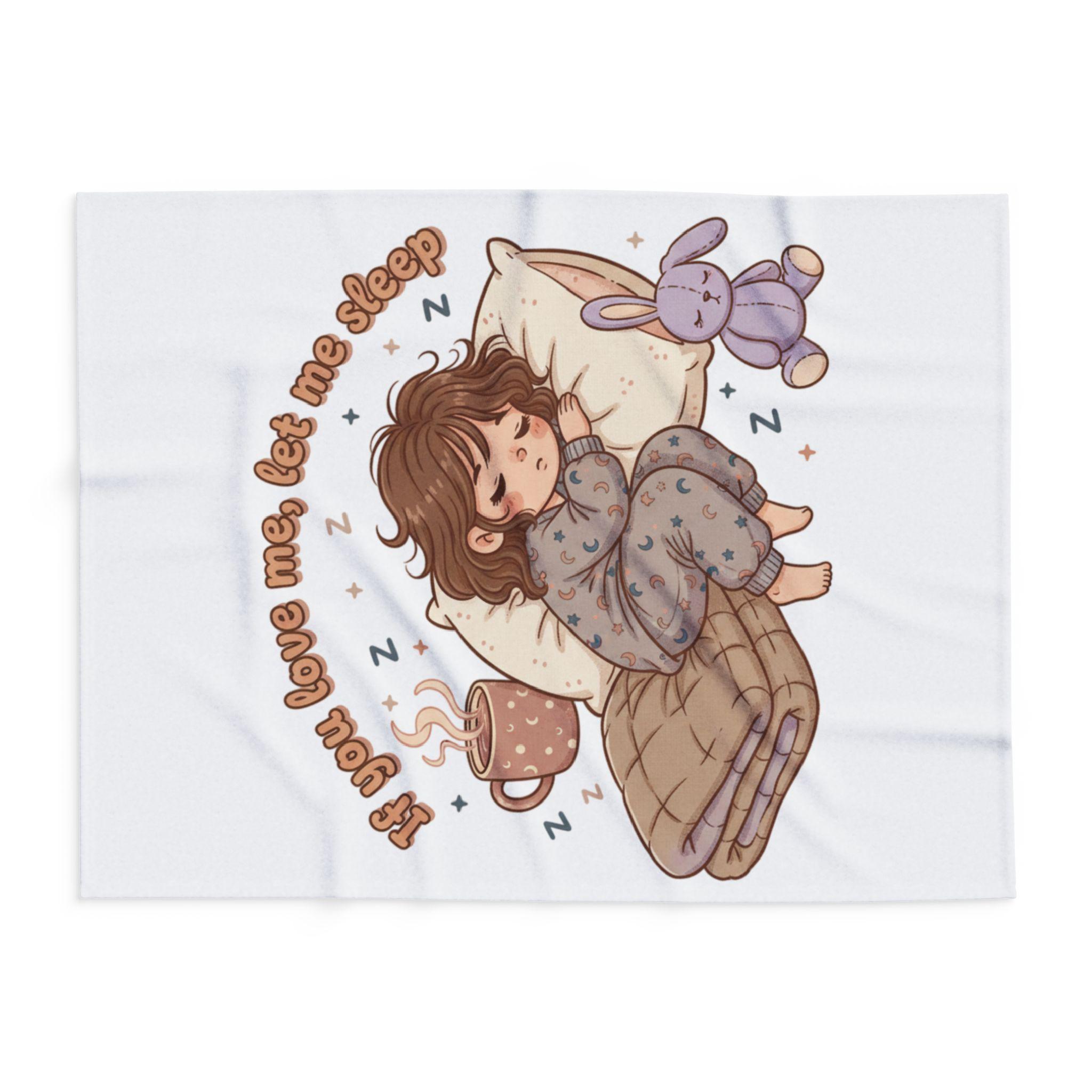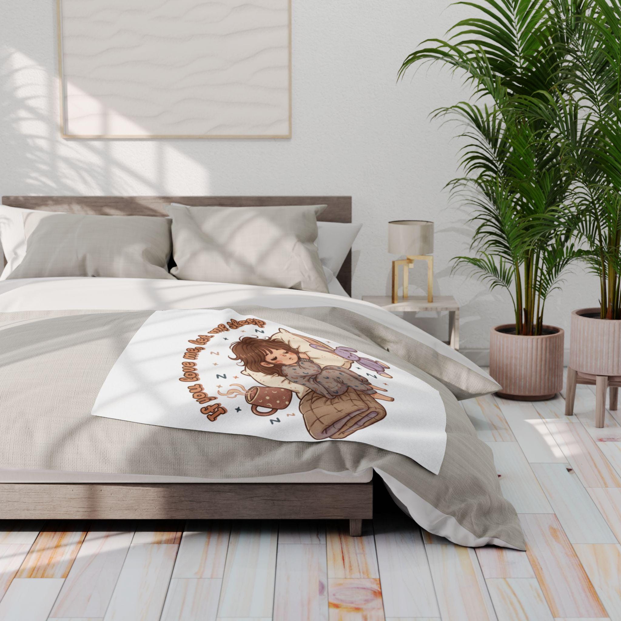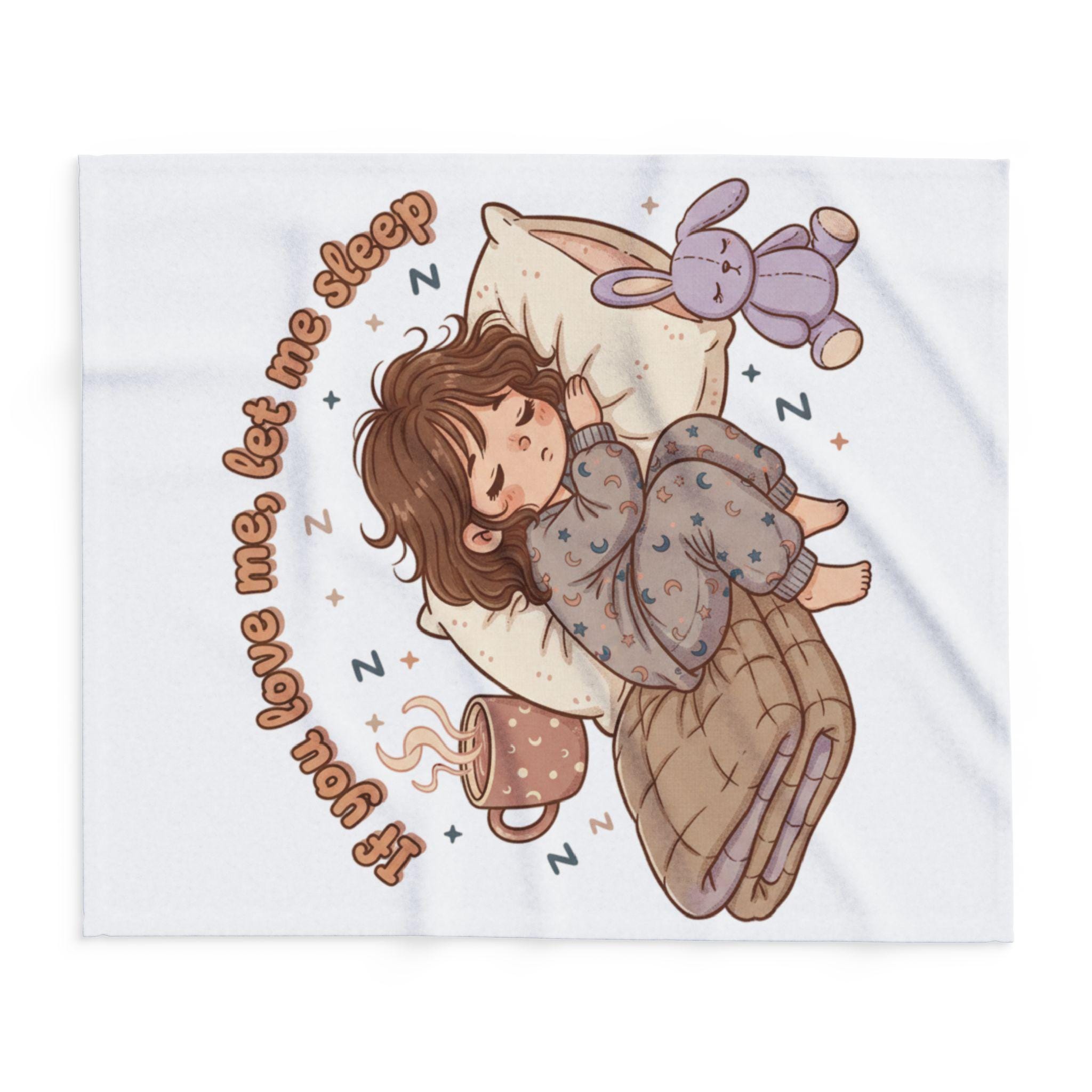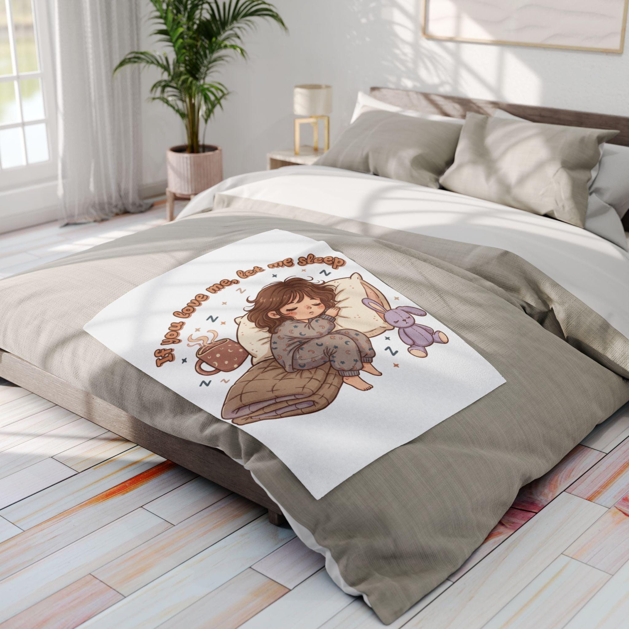 A cloud-soft fleece blanket that wraps quiet evenings in gentle warmth. The illustration shows a sleepy, pajama-clad figure curled up with a plush bunny, a steaming mug, and a folded blanket — the kind of sleepy, private scene that invites slow exhalations and bedside ritual. Muted warm browns and lavender tones keep the design cozy without shouting. Lay it over your lap during late-night reading, tuck it around shoulders while journaling by lamplight, or keep it ready on the sofa for low-energy self-care nights. It feels like a small, steady comfort that holds the hush of bedtime and the softness of home.