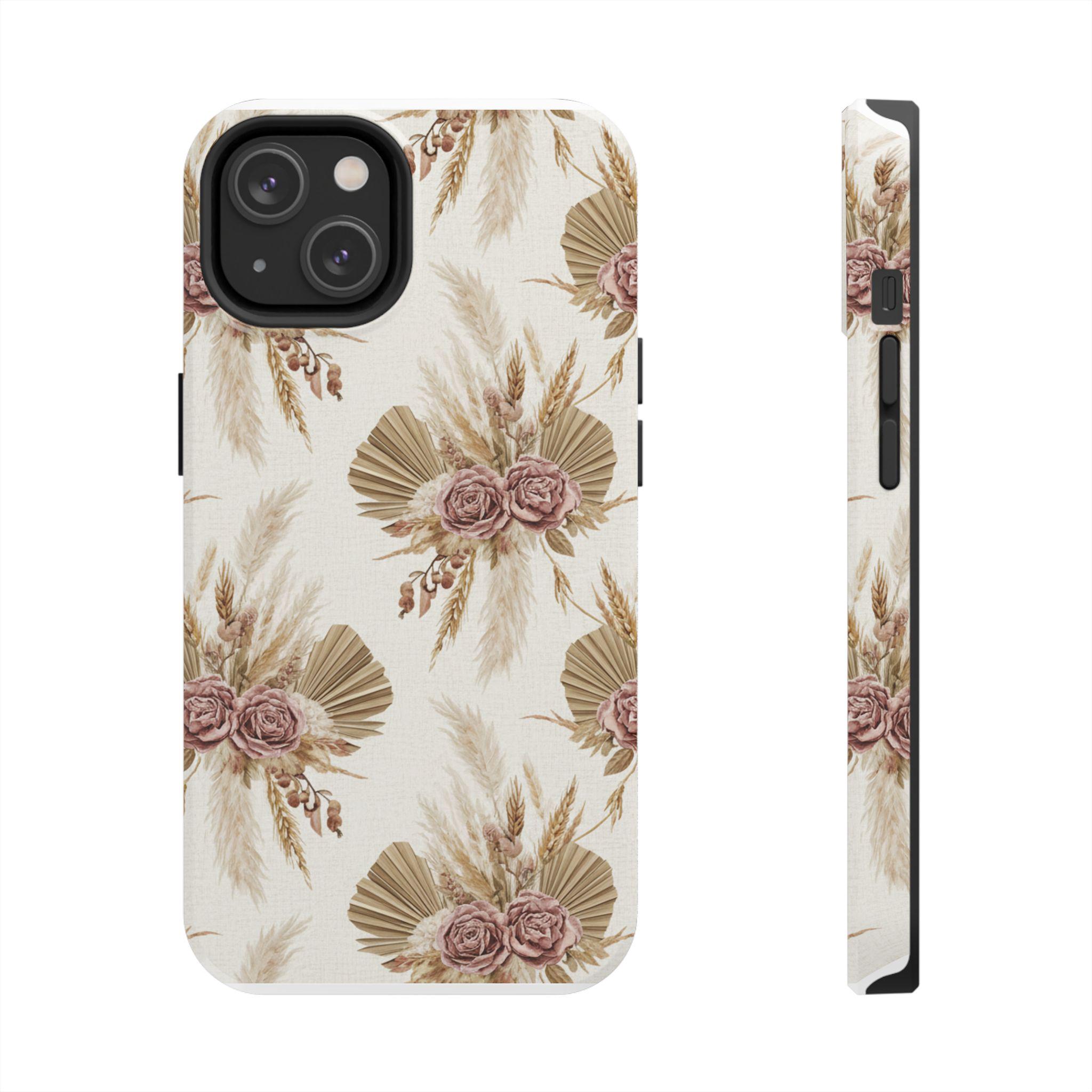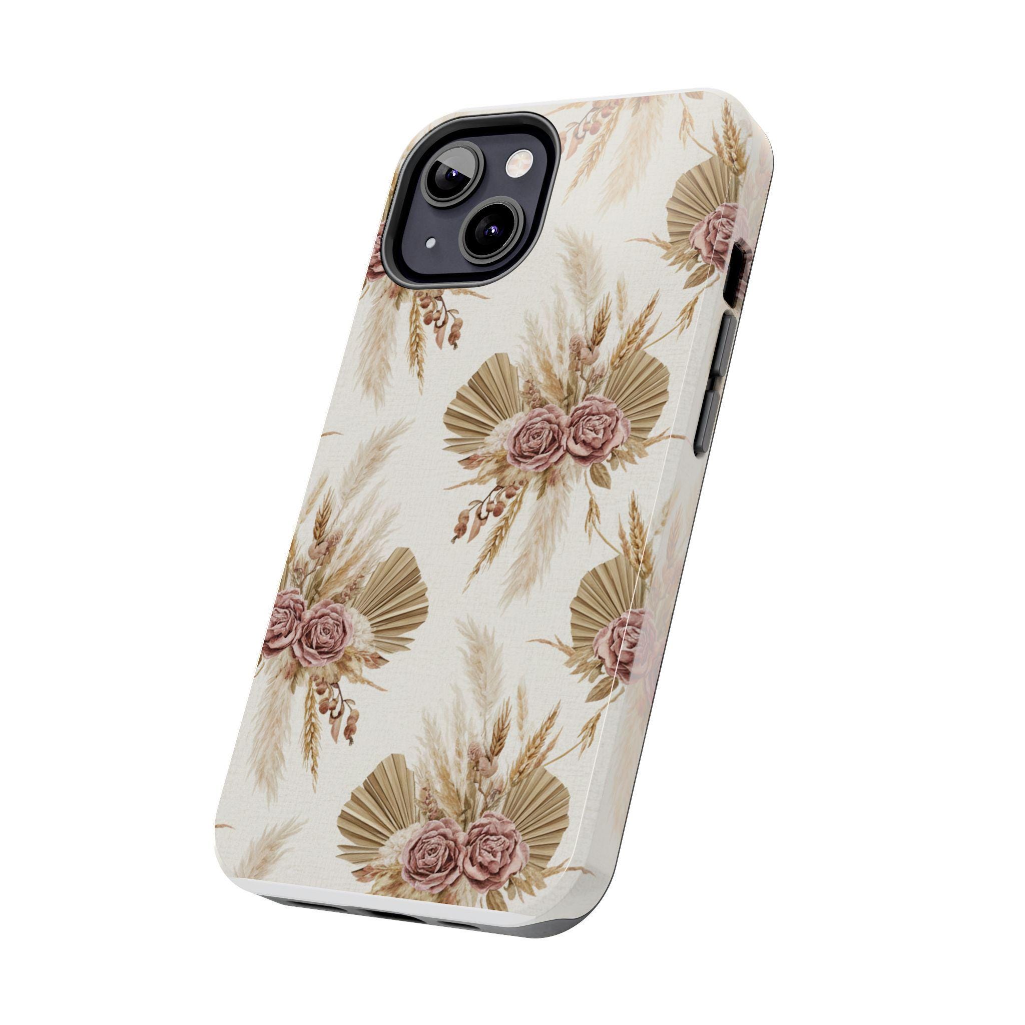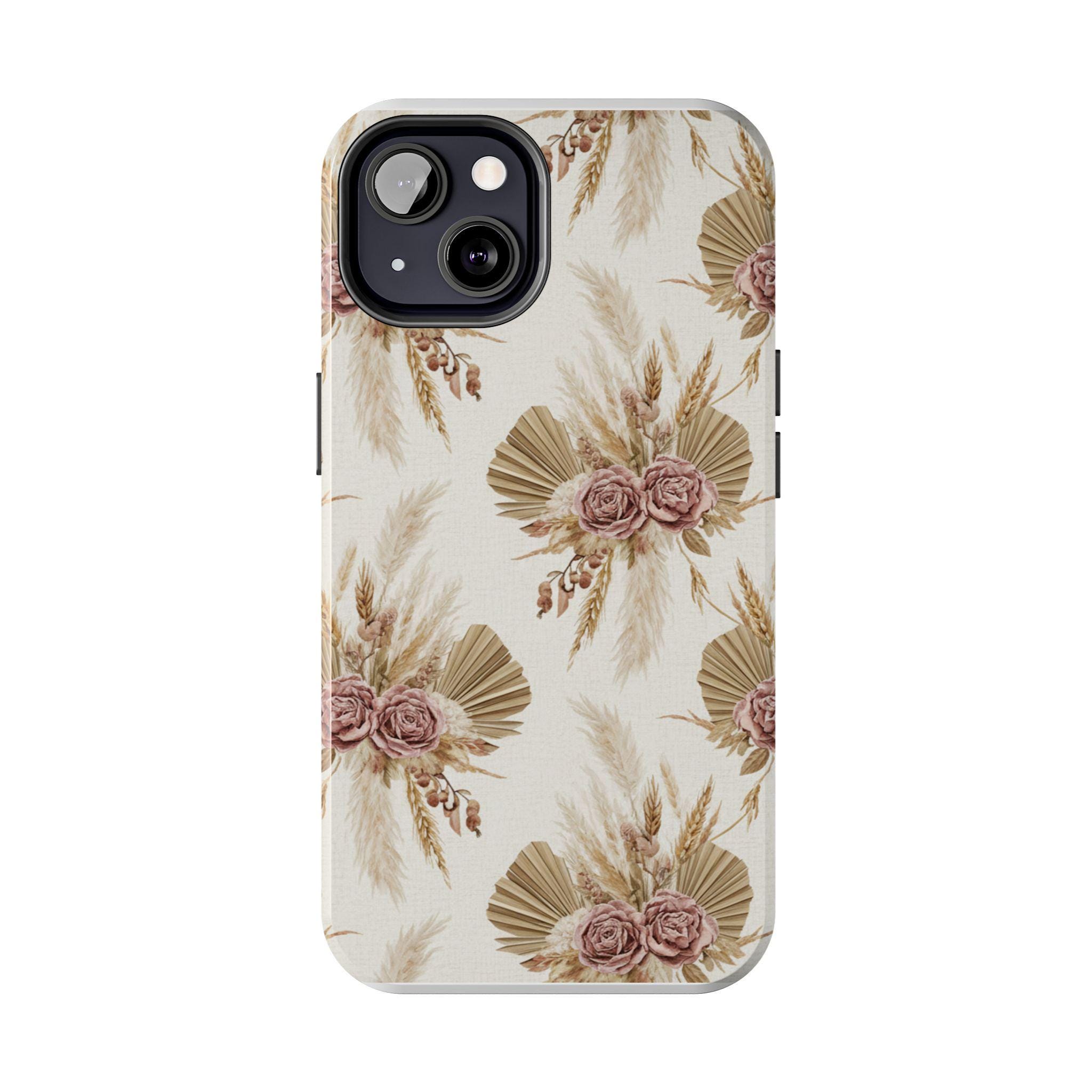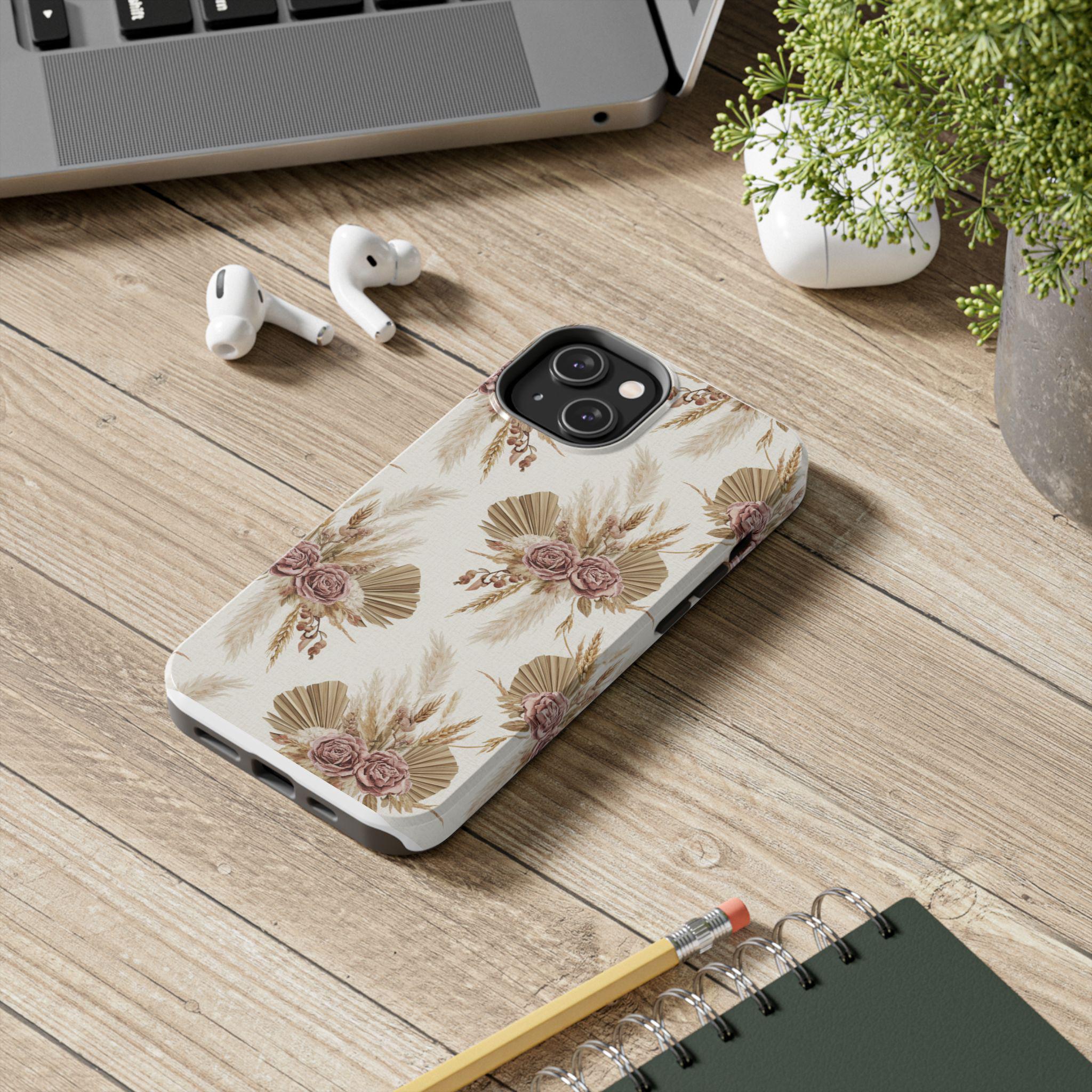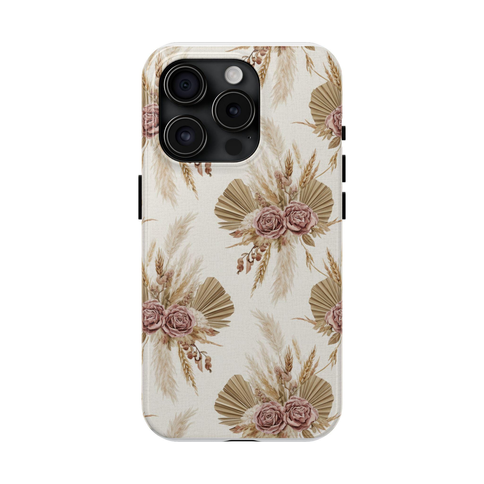 A slim, durable phone case dressed in soft, neutral botanicals. The warm cream background and faded mauve roses pair with pampas grass and fan palms to create a gentle, earthy look that feels both modern and vintage. It slips on easily, keeps corners and edges protected without bulk, and carries a glossy sheen that deepens the muted tones. Use it when you want your phone to feel like a personal accessory — calm, curated, and a little nostalgic during city strolls, coffee dates, or quiet mornings at home.