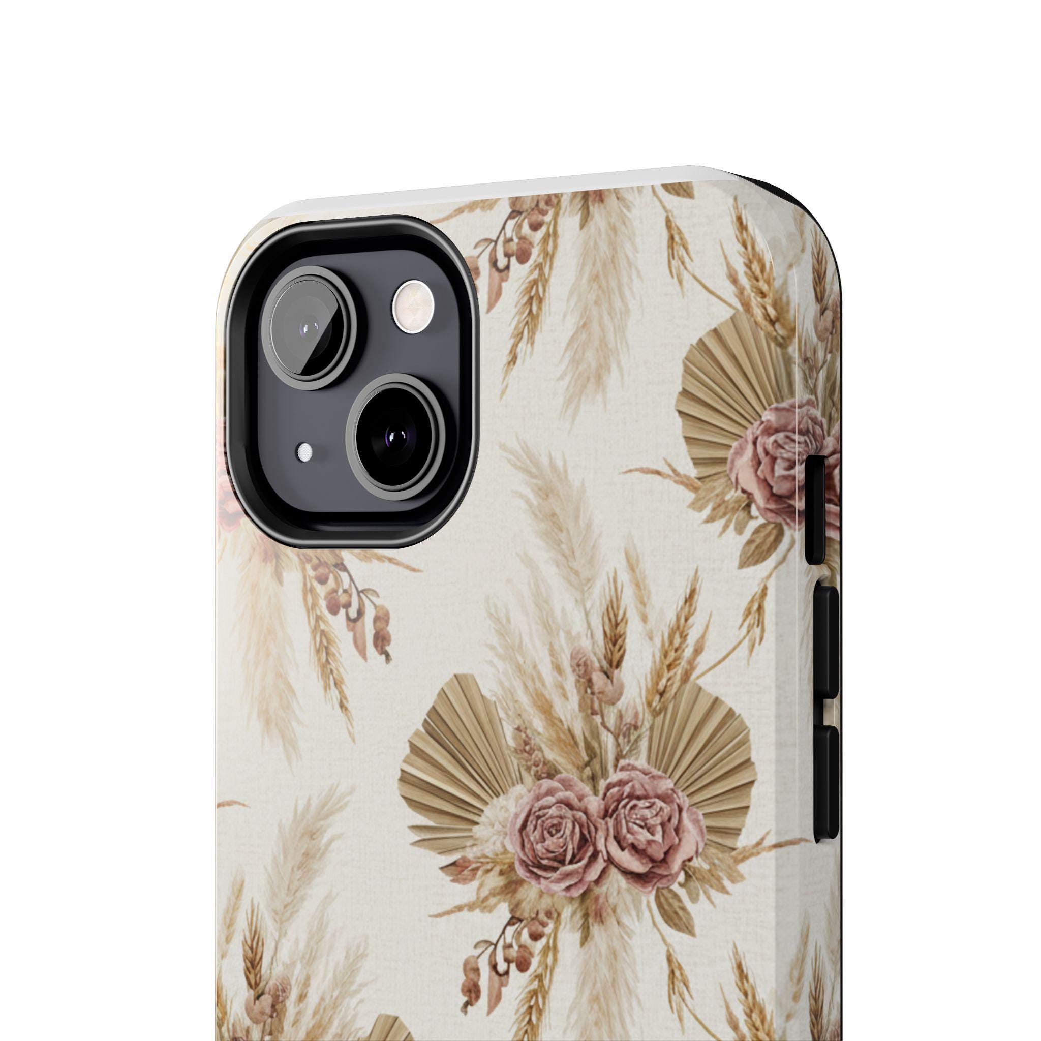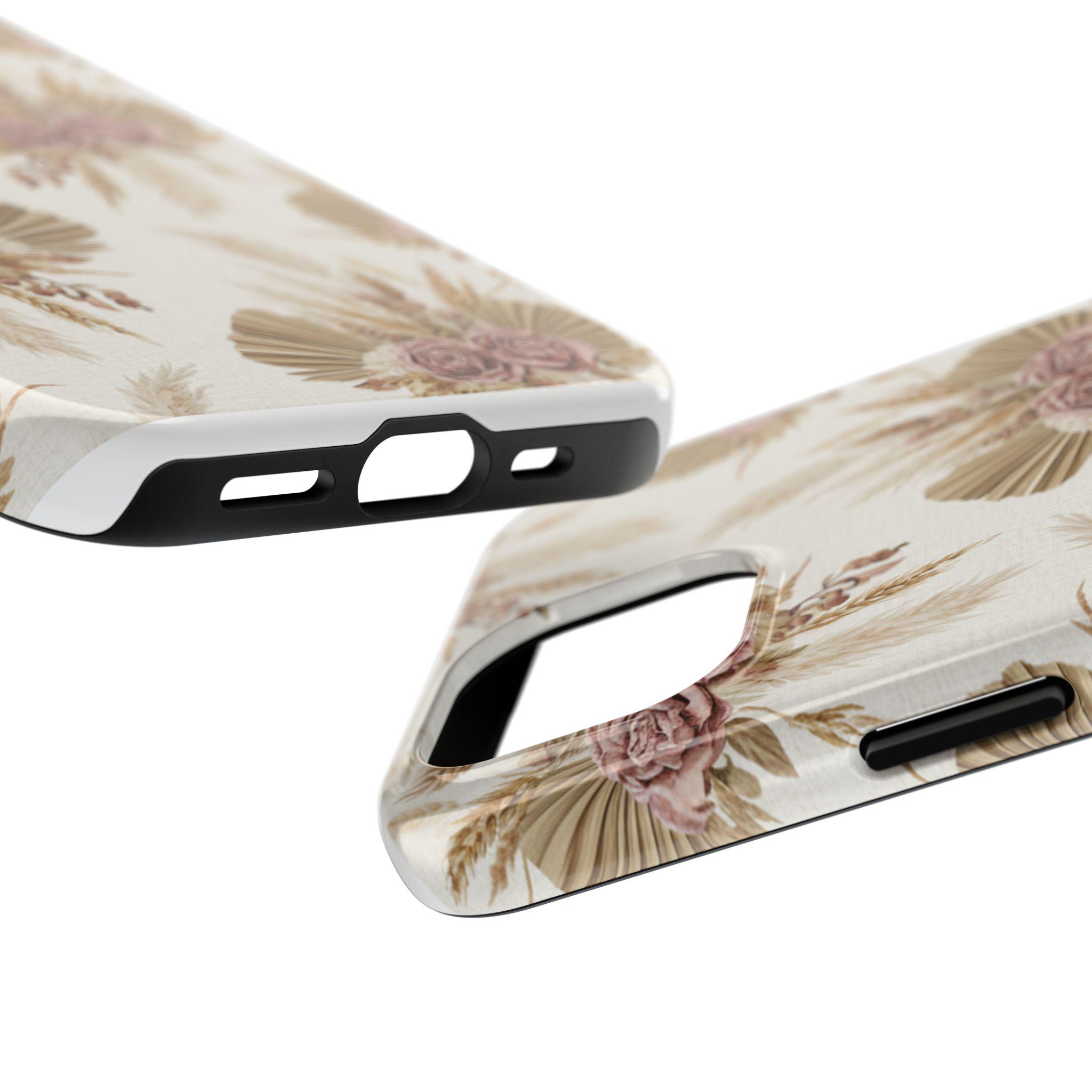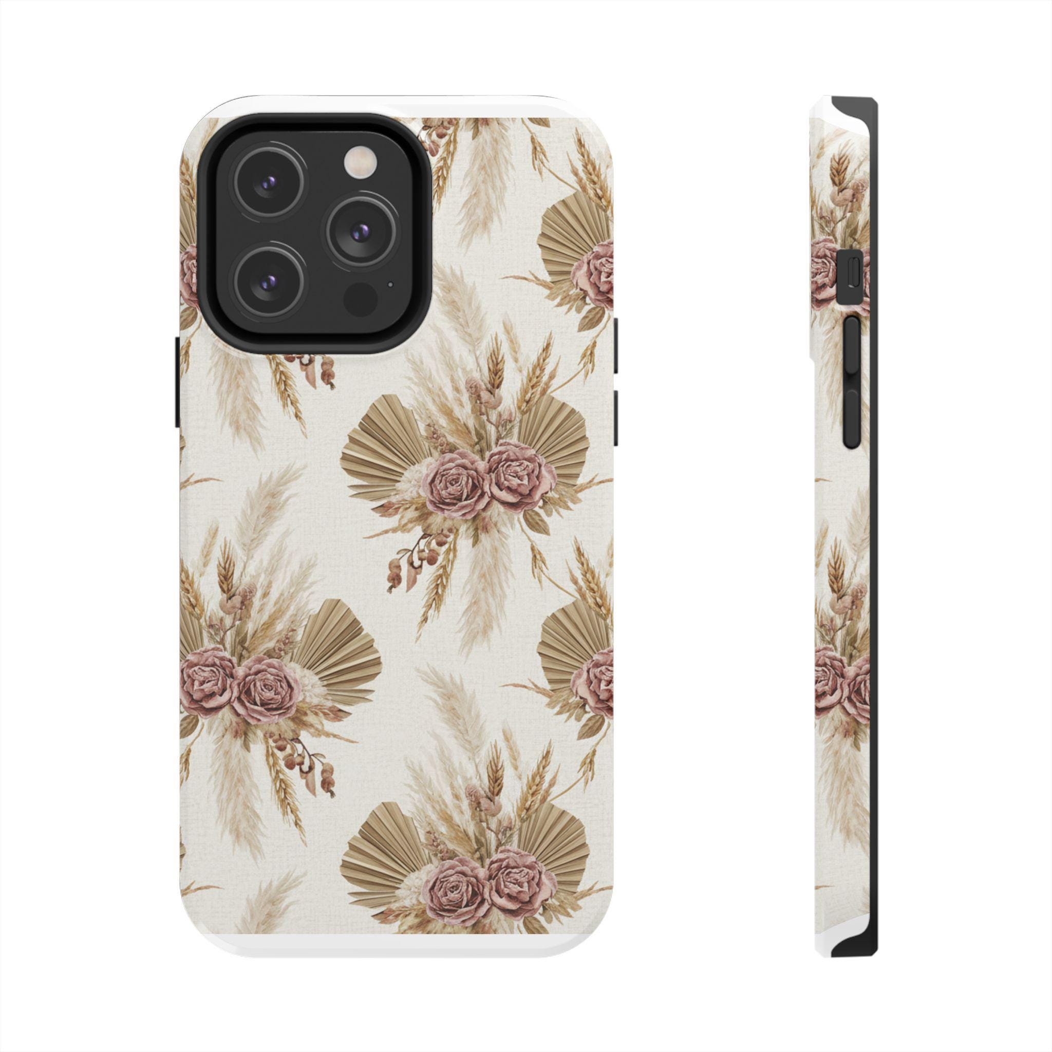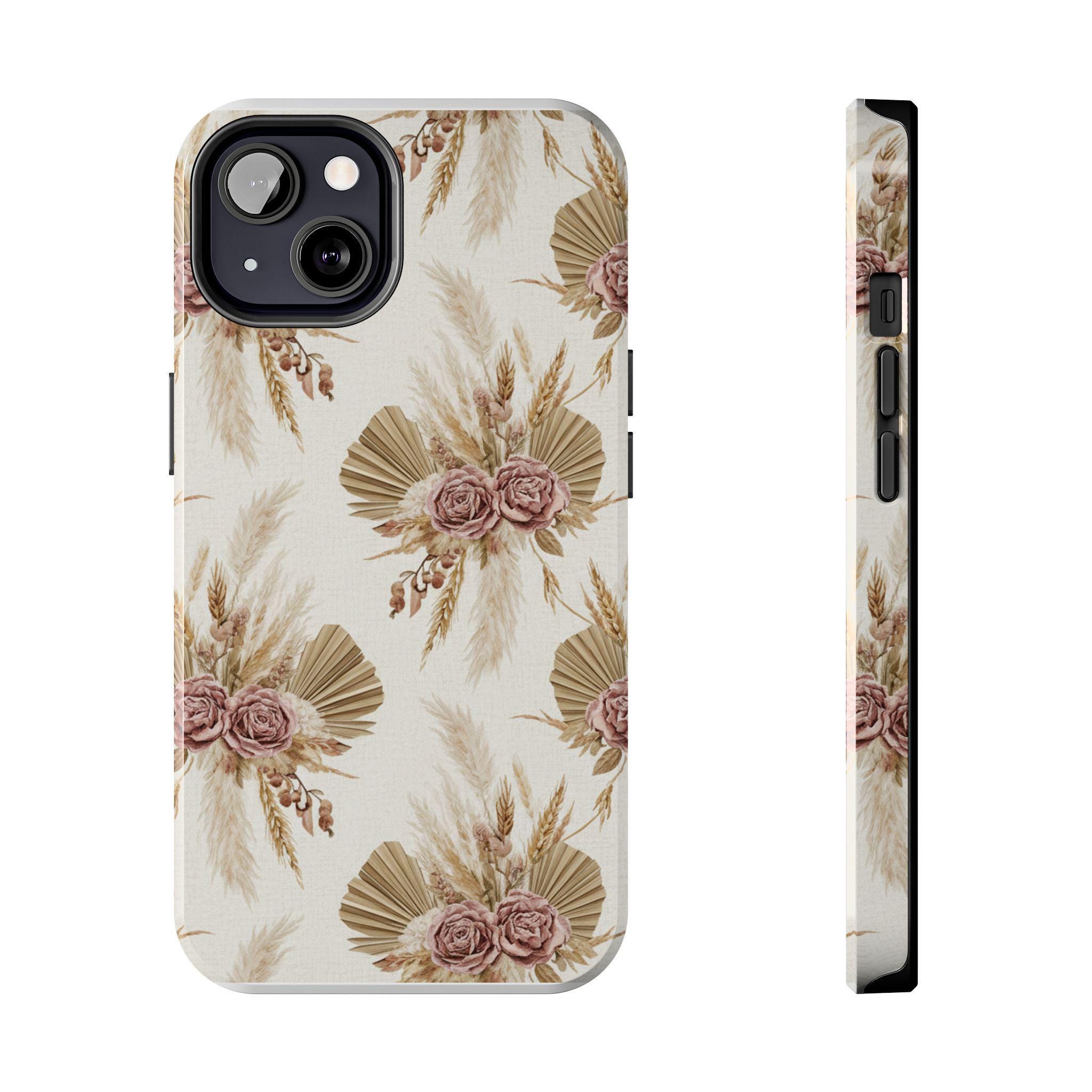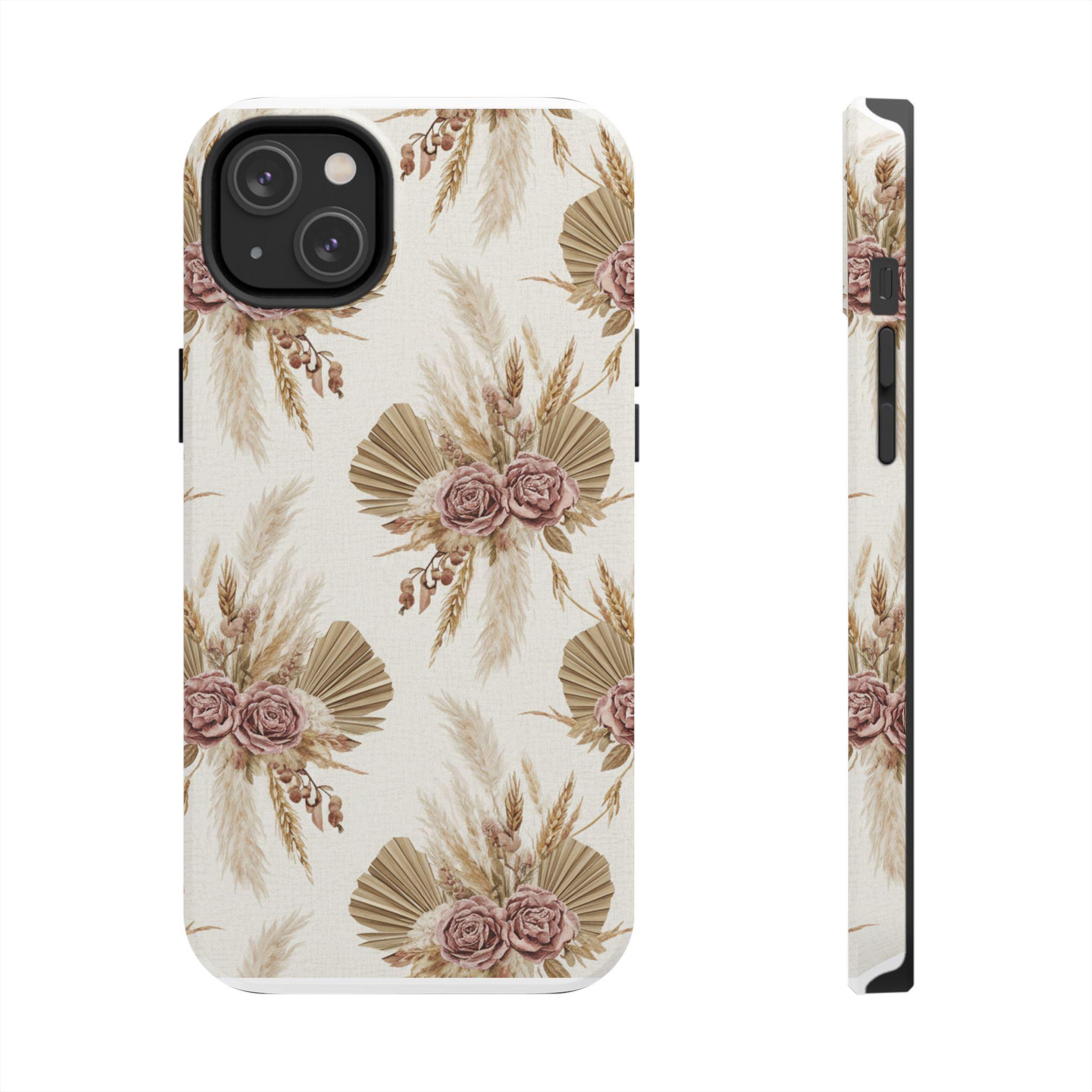 A slim, durable phone case dressed in soft, neutral botanicals. The warm cream background and faded mauve roses pair with pampas grass and fan palms to create a gentle, earthy look that feels both modern and vintage. It slips on easily, keeps corners and edges protected without bulk, and carries a glossy sheen that deepens the muted tones. Use it when you want your phone to feel like a personal accessory — calm, curated, and a little nostalgic during city strolls, coffee dates, or quiet mornings at home.