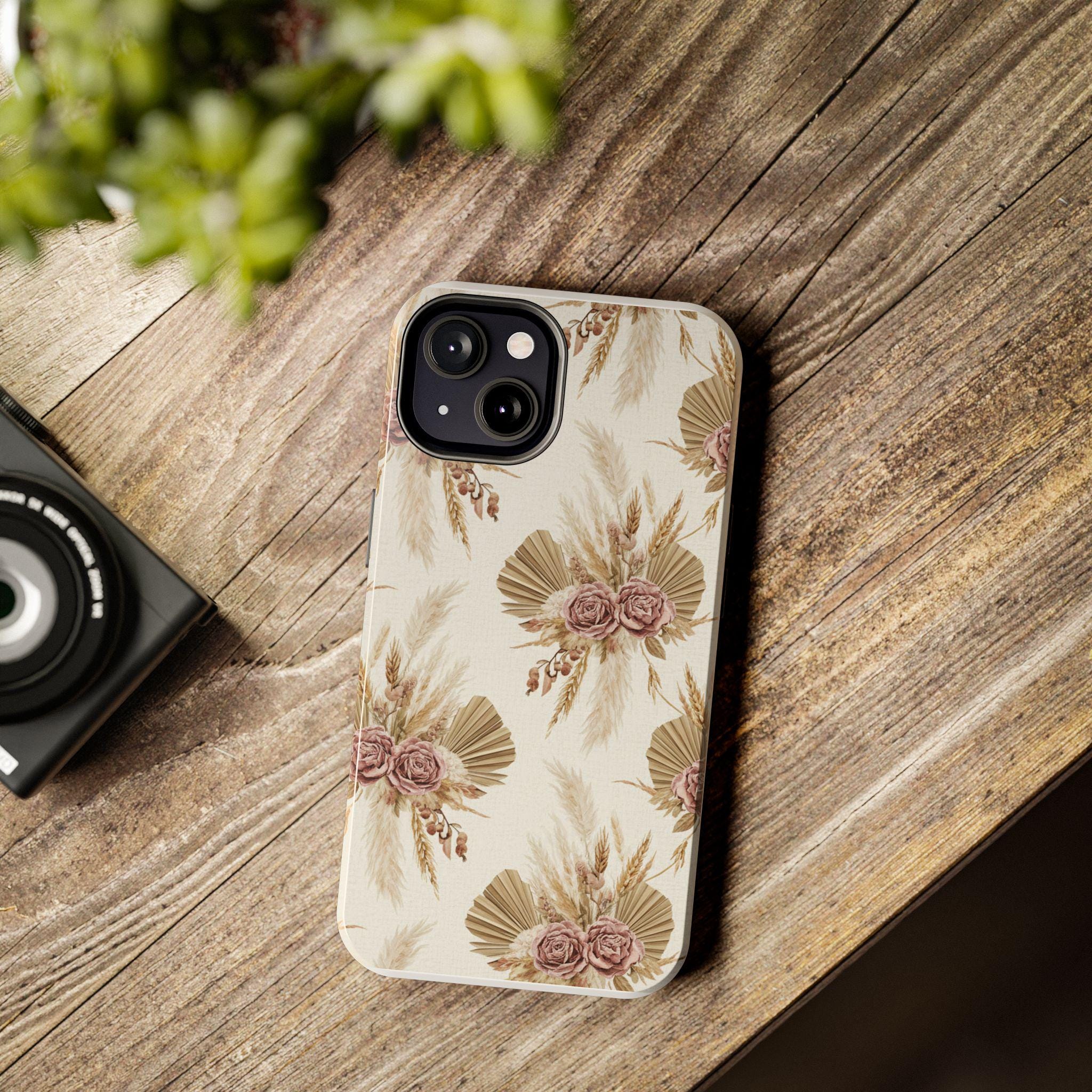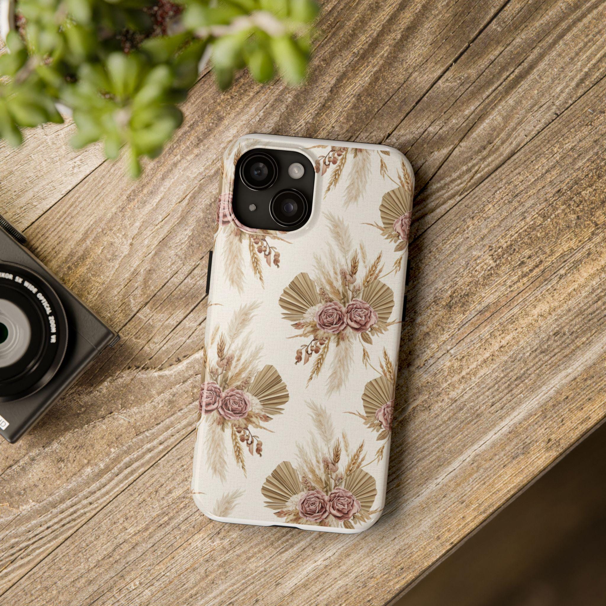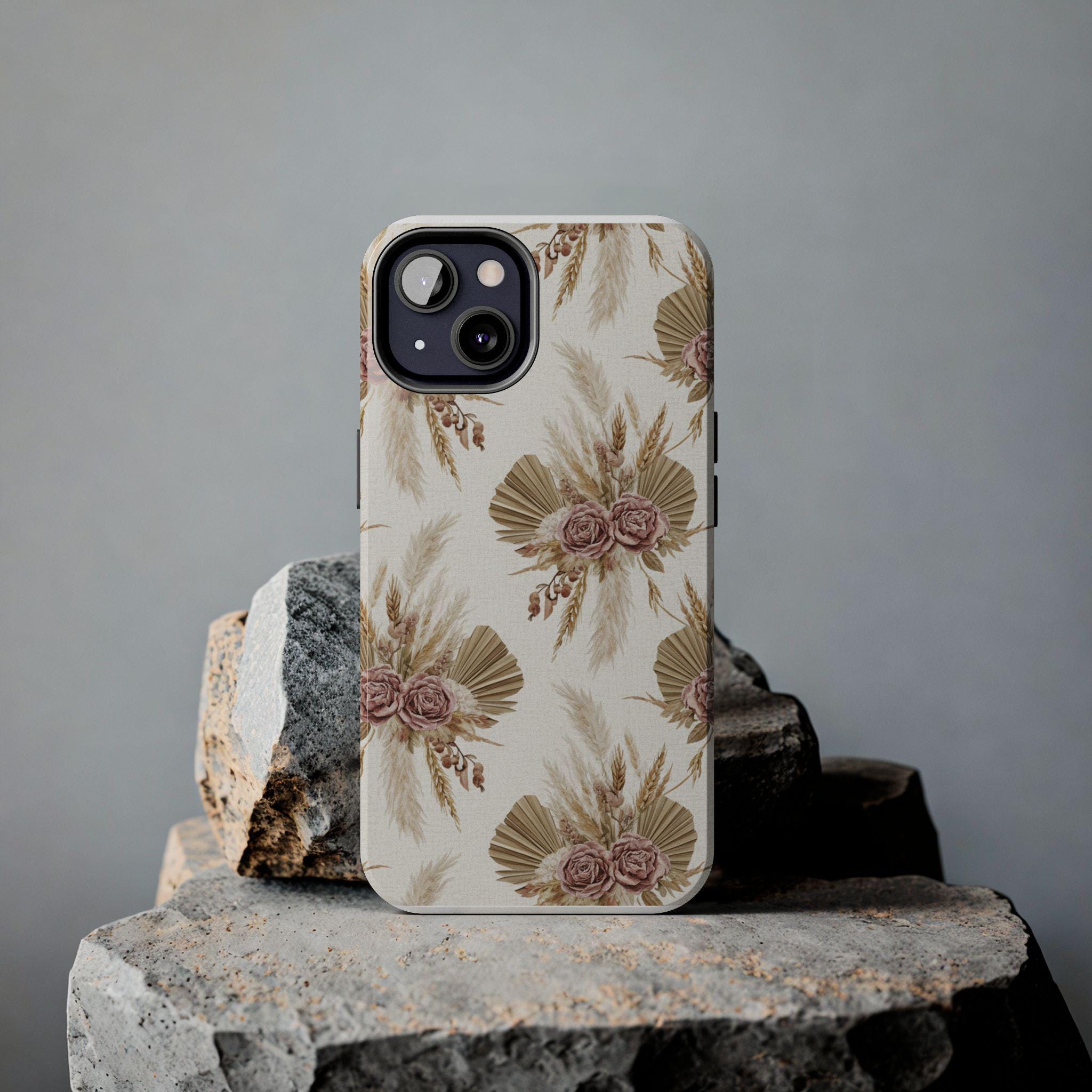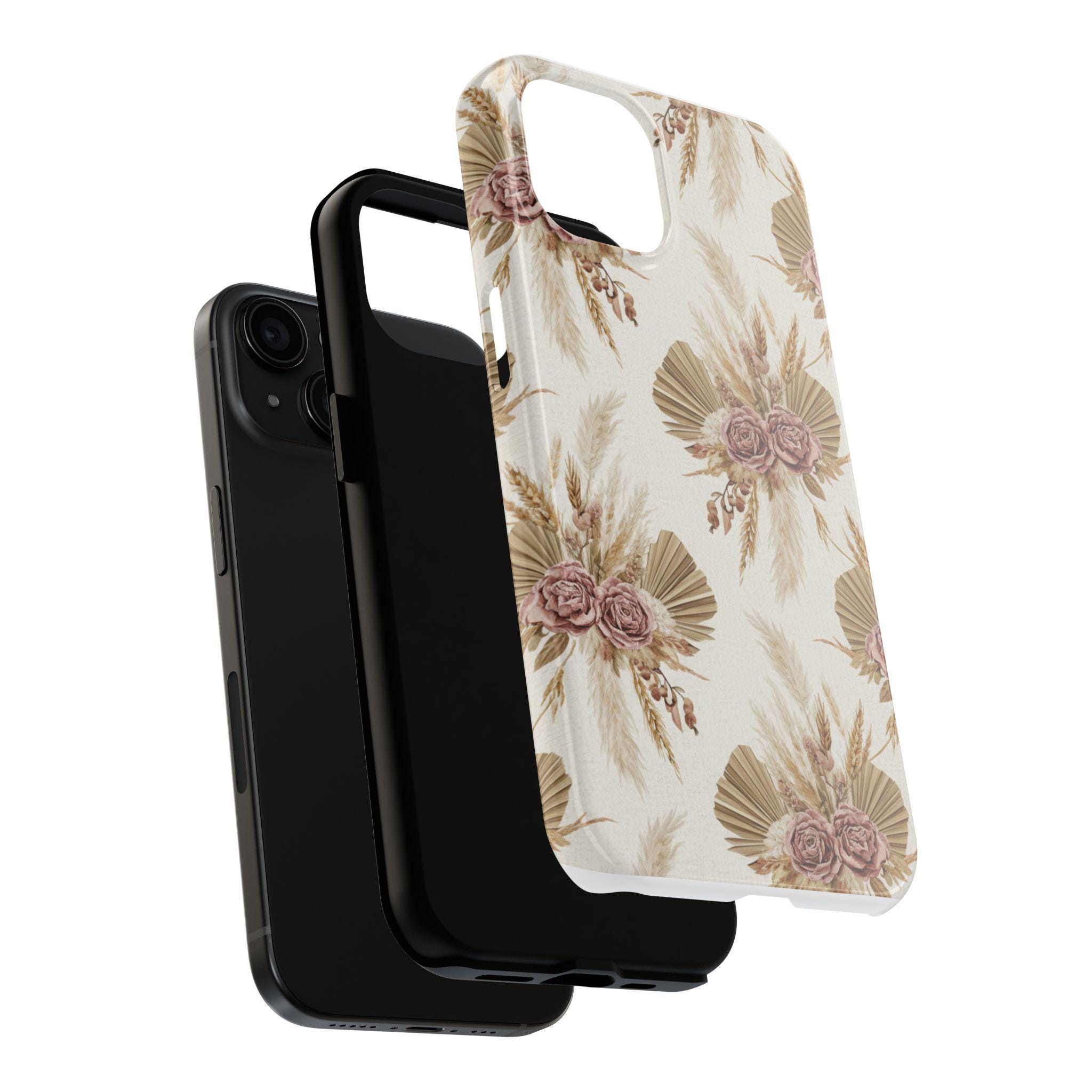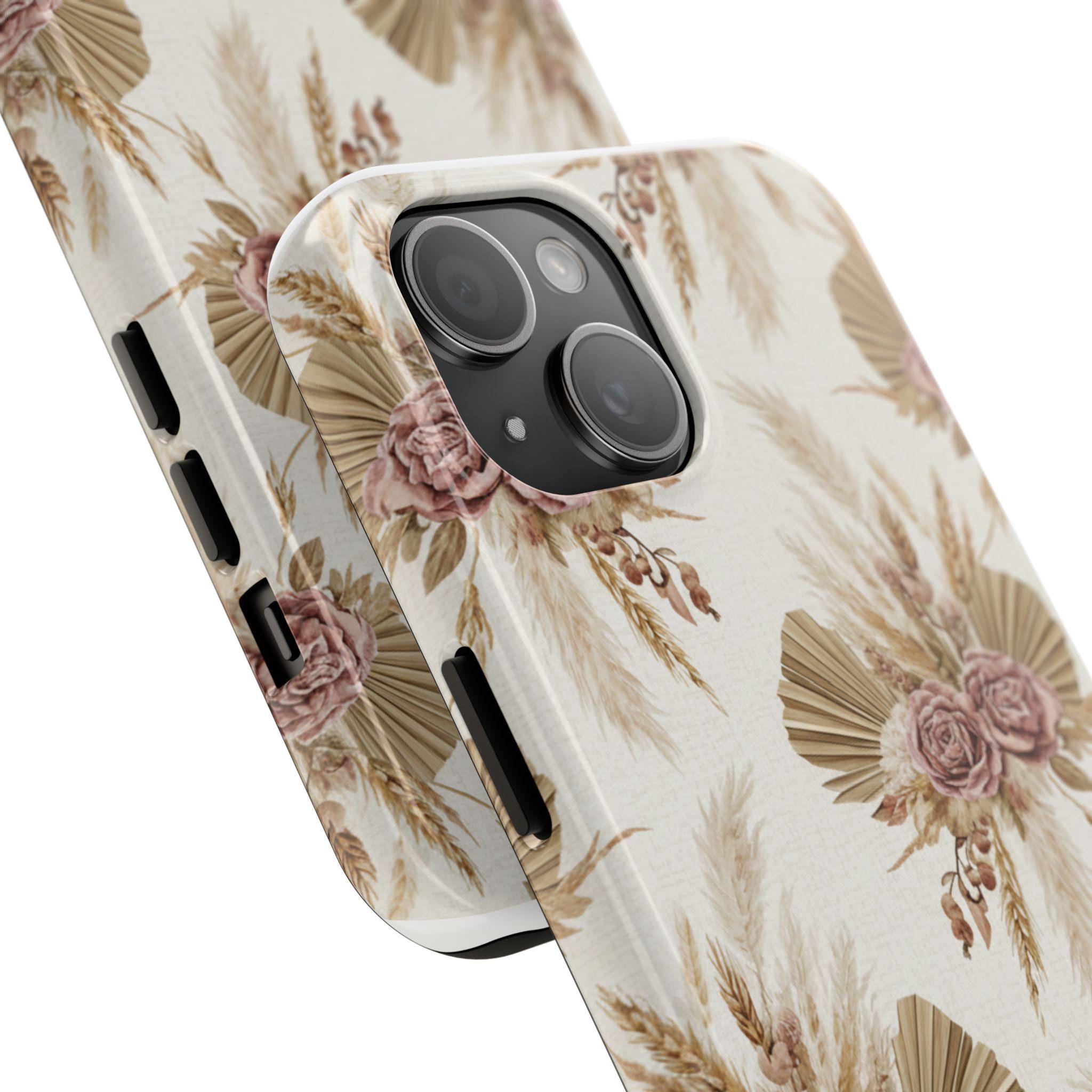 A slim, durable phone case dressed in soft, neutral botanicals. The warm cream background and faded mauve roses pair with pampas grass and fan palms to create a gentle, earthy look that feels both modern and vintage. It slips on easily, keeps corners and edges protected without bulk, and carries a glossy sheen that deepens the muted tones. Use it when you want your phone to feel like a personal accessory — calm, curated, and a little nostalgic during city strolls, coffee dates, or quiet mornings at home.